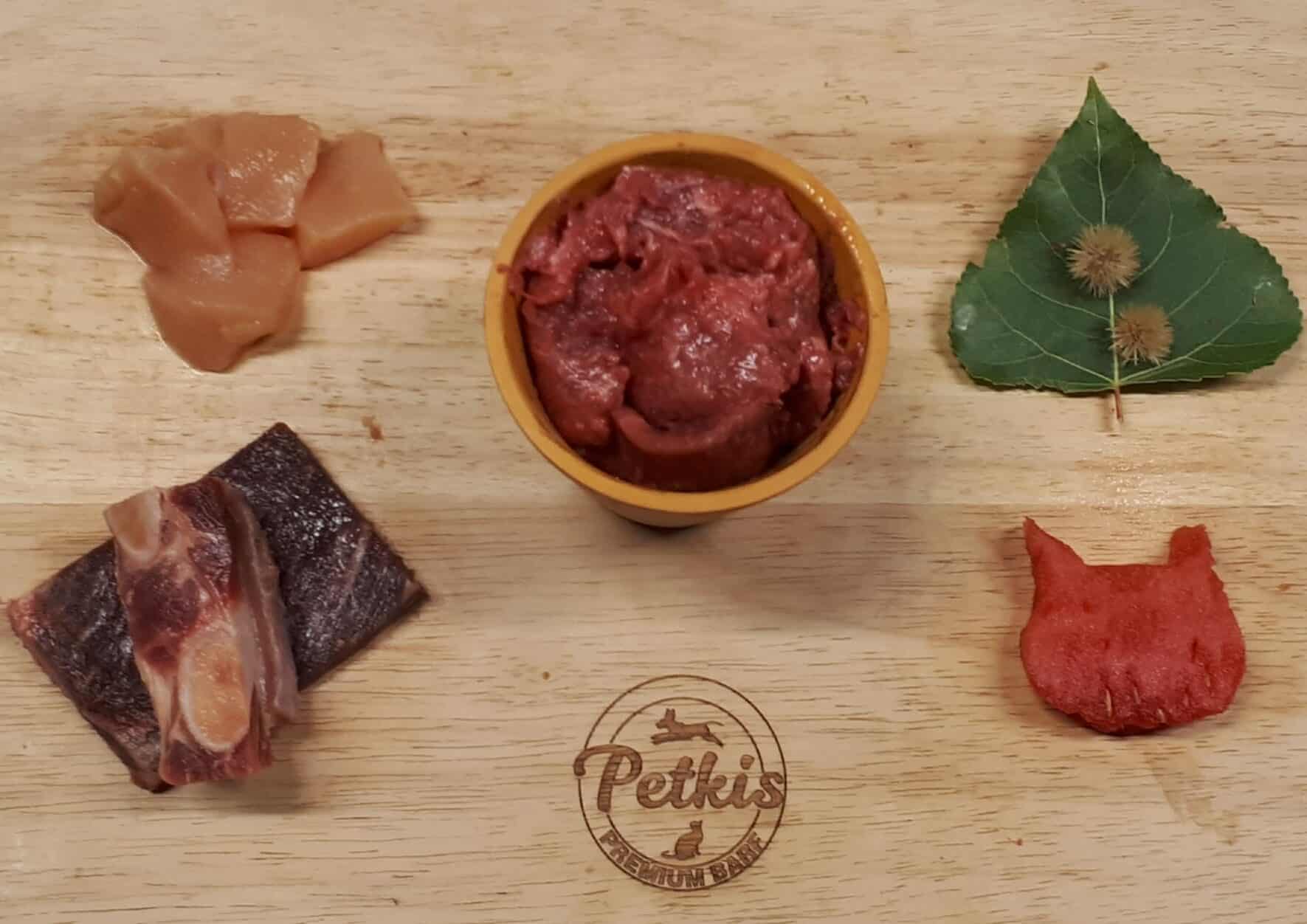 Huesos carnosos, carne magra y vísceras: 50% carne magra de ciervo, 20% carcasa de pollo, 20% corazón de ciervo, 10% hígado de ciervo.