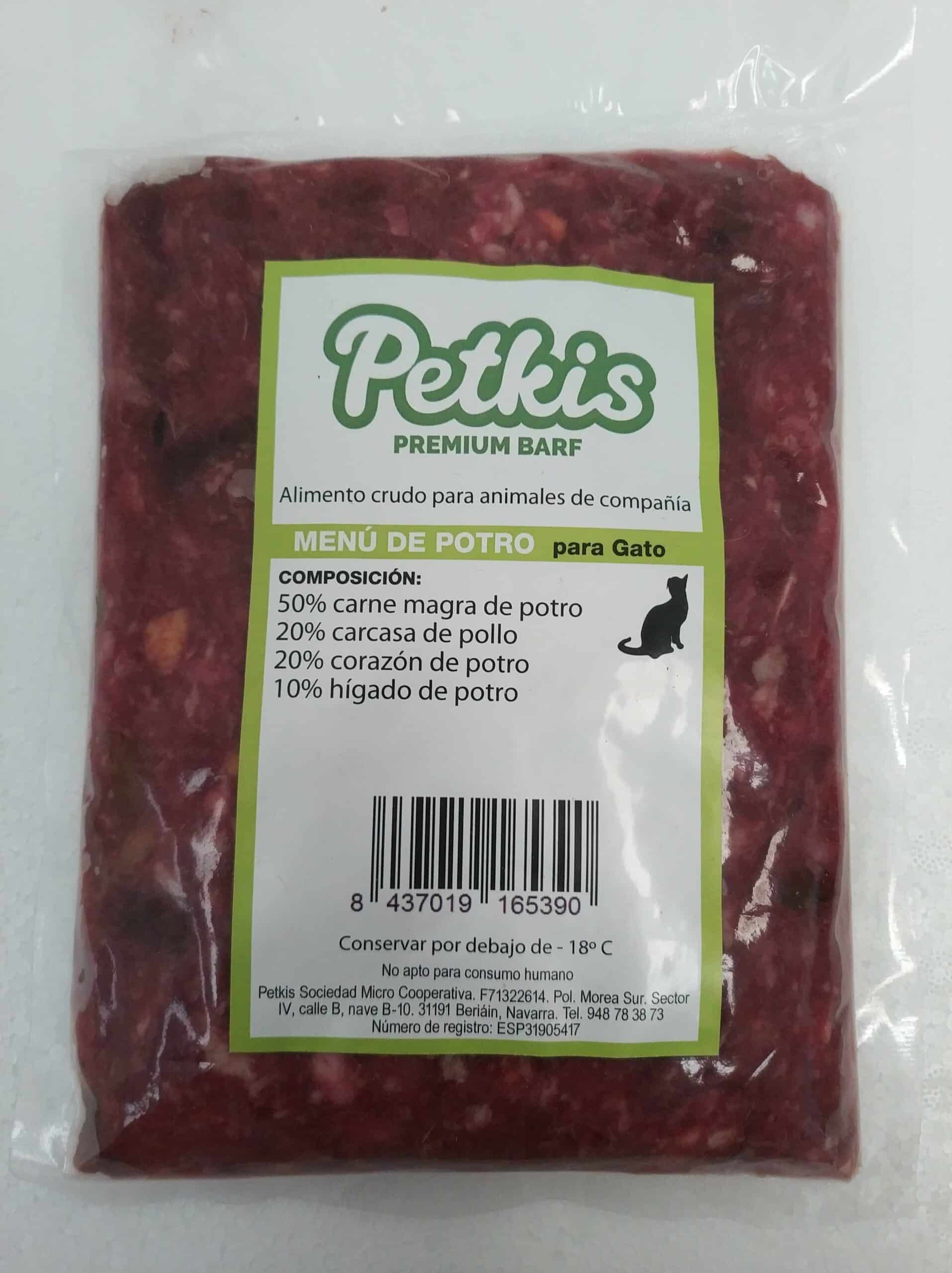 Huesos carnosos, carne magra y vísceras: 50% carne de potro, 20% carcasa de pollo, 20% corazón de potro y 10% hígado de potro.
