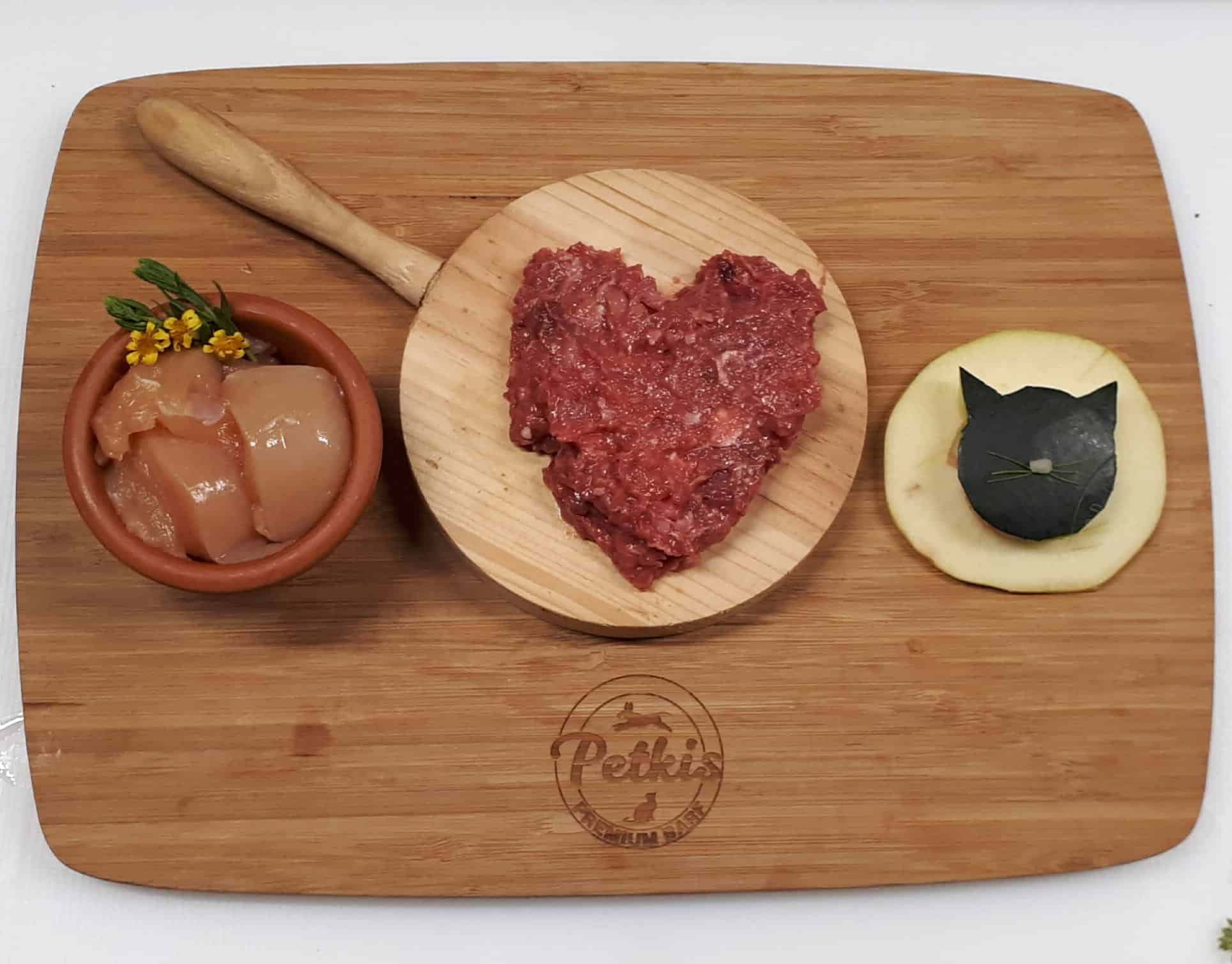 Huesos carnosos, carne magra y vísceras: 50% carne magra de pollo, 20% carcasa de pollo, 20% corazón de pollo y 10 % hígado de cordero.