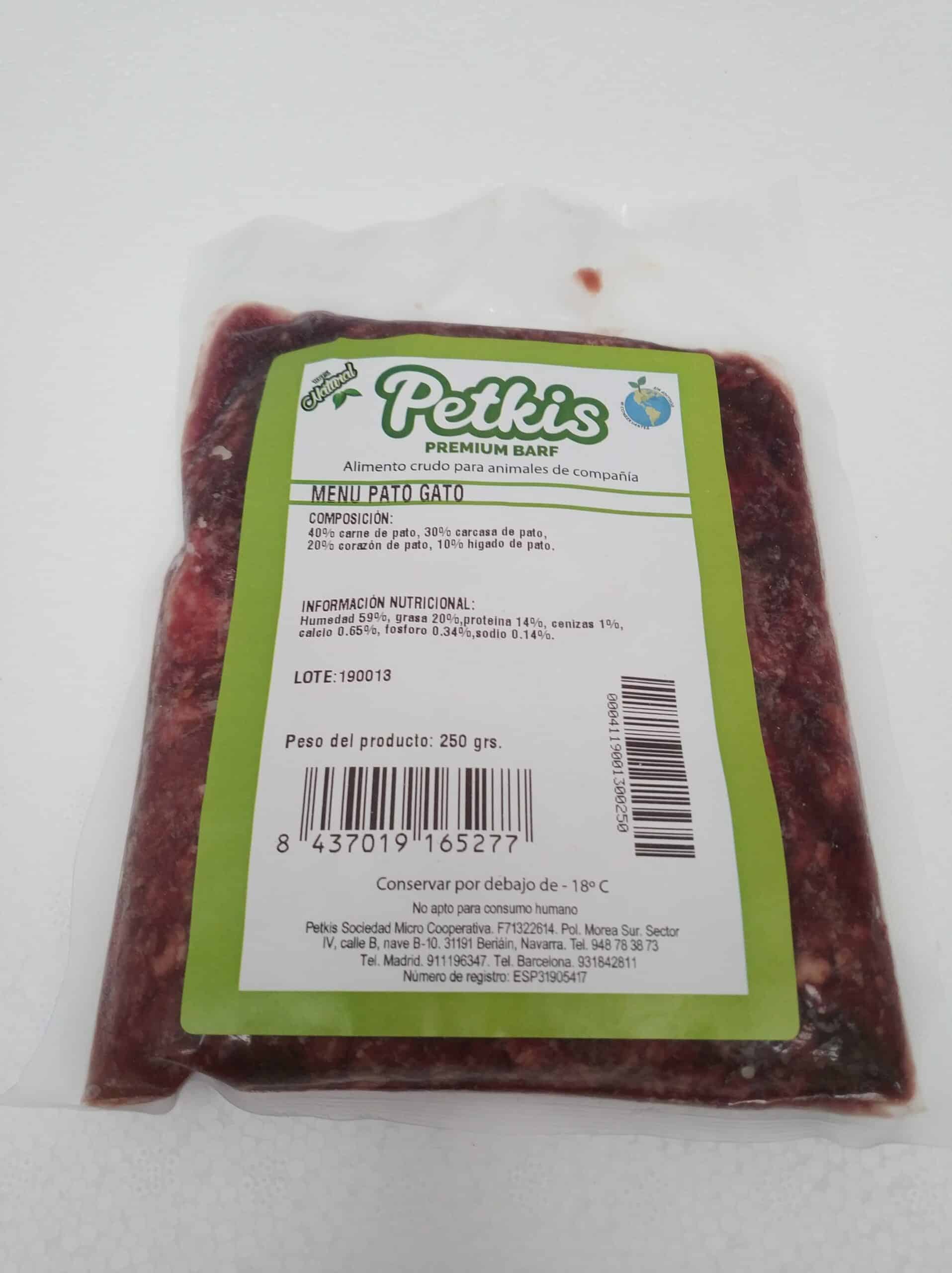 Huesos carnosos, carne magra y vísceras: 50% carne de pato, 20% carcasa de pato, 20% corazón de pato y 10% hígado de pato.