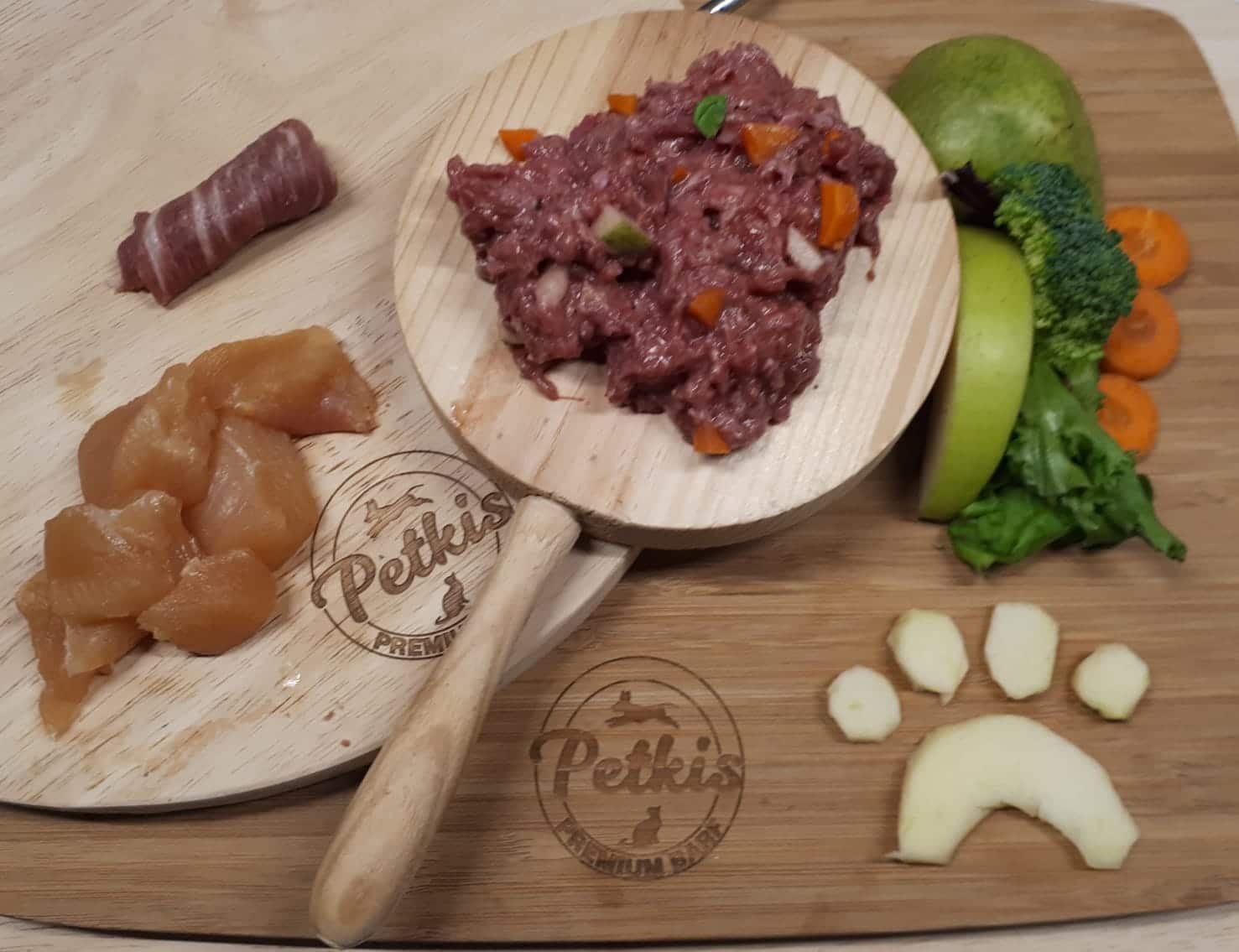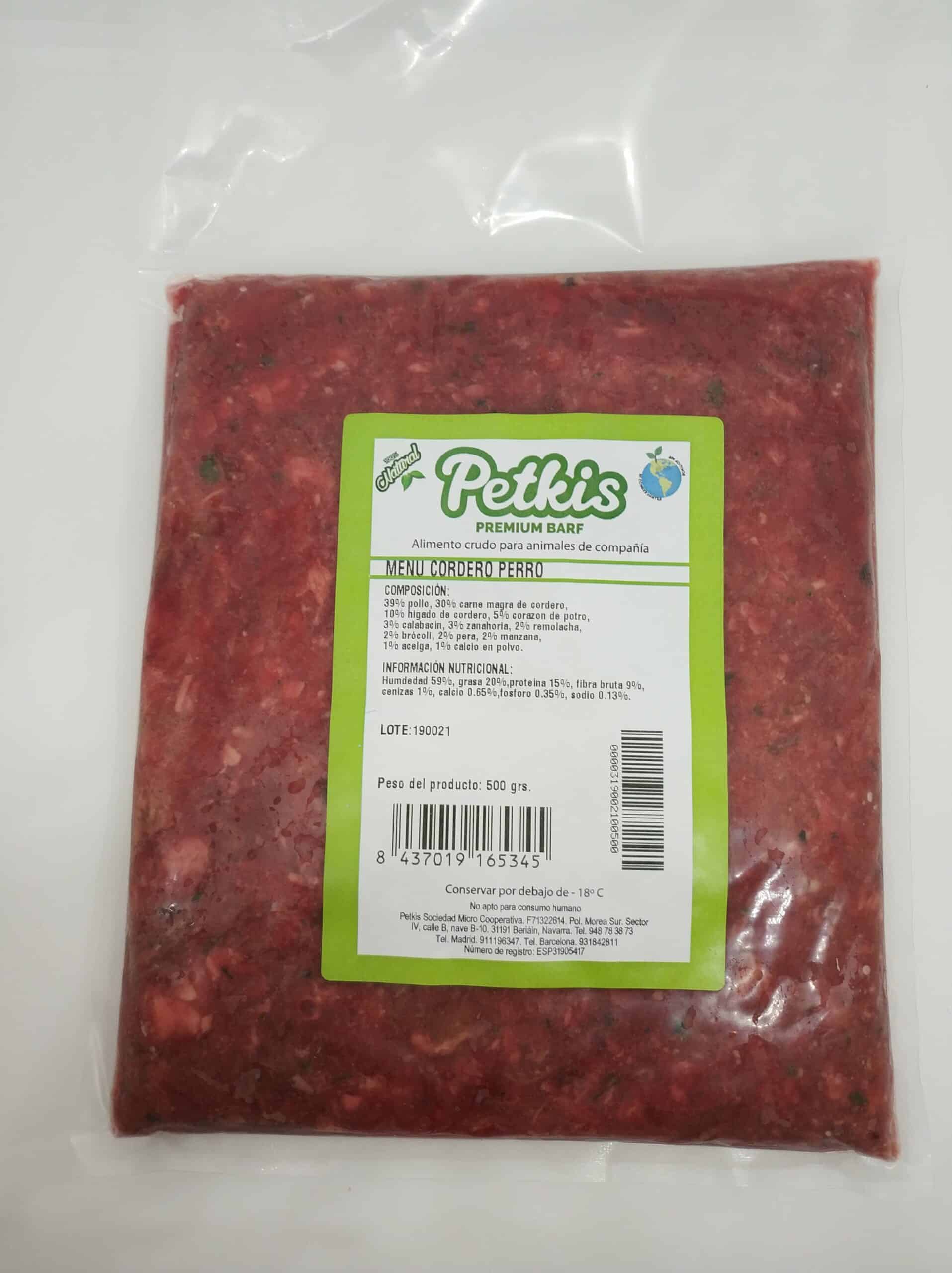 Menú BARF completo de cordero con verduras y frutas frescas de cercanía. El cordero es una carne que aporta un extra de grasa. Por eso, es ideal para perros con bajo peso.
