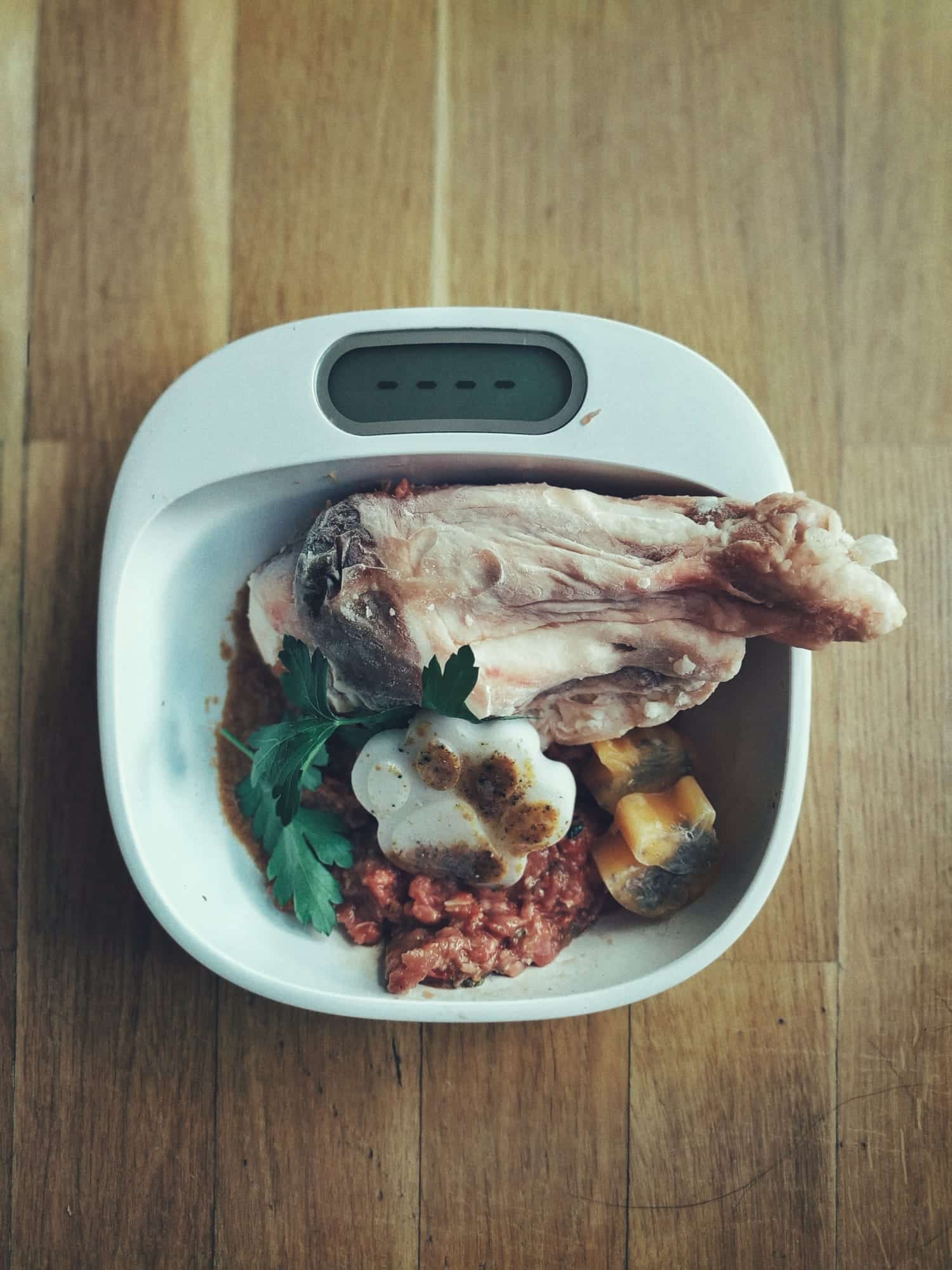 Menú BARF completo de pollo de Navarra con verduras y frutas frescas de cercanía. El pollo es una carne con un bajo contenido en grasas saturadas. De ahí que sea perfecta para perros sedentarios.