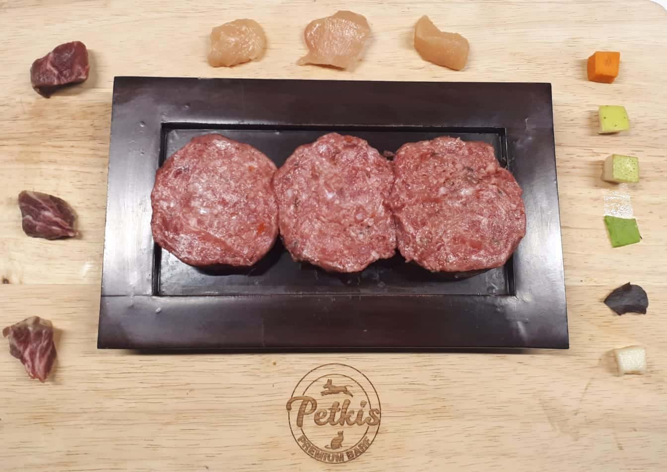 Huesos carnosos, carne magra y vísceras: 30% carne magra de ternera, 40% carcasa de pollo, 7% hígado de ternera, 5% corazón de ternera, 3% riñón de ternera,